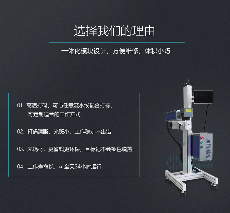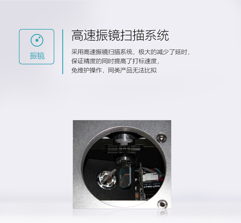 采用光纖激光器輸出激光,電光轉(zhuǎn)換率高,體積小巧,不需外部水冷卻設(shè)備,光束質(zhì)量好。光纖激光器先進(jìn)的固體激光器,使用壽命長(zhǎng),維護(hù)費(fèi)用低。觸摸飛行打標(biāo)系統(tǒng),操作方便,穩(wěn)定性高,運(yùn)行速度快,現(xiàn)行的3.0版系統(tǒng),是全球飛行打標(biāo)速度較快的系統(tǒng)之一。